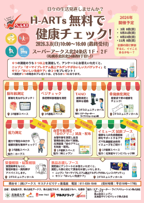 札幌市ウェルネス推進の取り組みとして、3月8日(日)開催「H-ARTs無料でチェック!」(札幌市スーパーアークス北24条店)に協賛することになりました。
